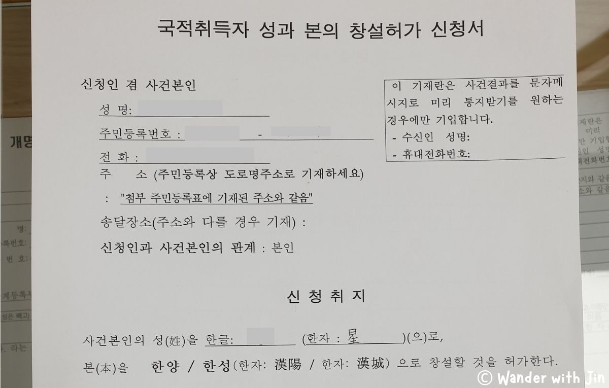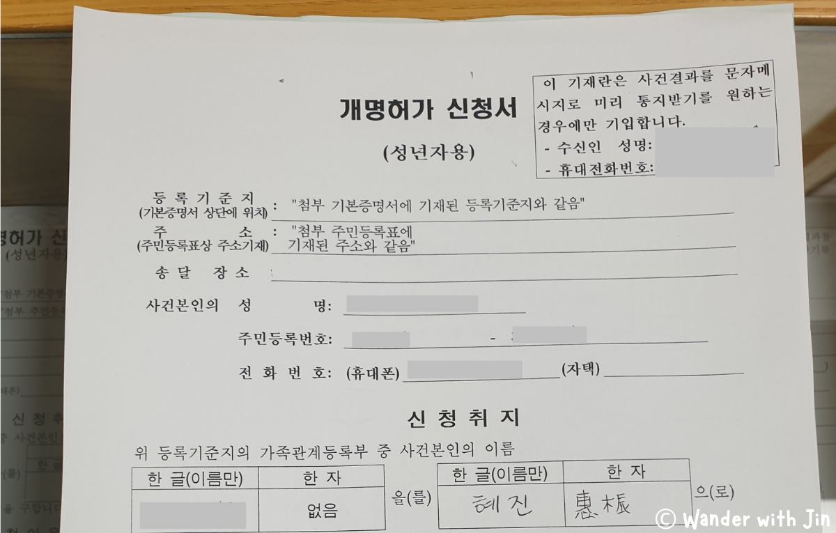TIP: If you don’t know how to write in Chinese, you need to go to the personnel and tell them your Korean name. You will receive a 인명용한자코드 where you need to choose and encircle the hanja of your name. After encircling, follow the characters and write it on your own since they are not allowed to do it for you. If you think you can’t do that, bring your husband with you when you apply.